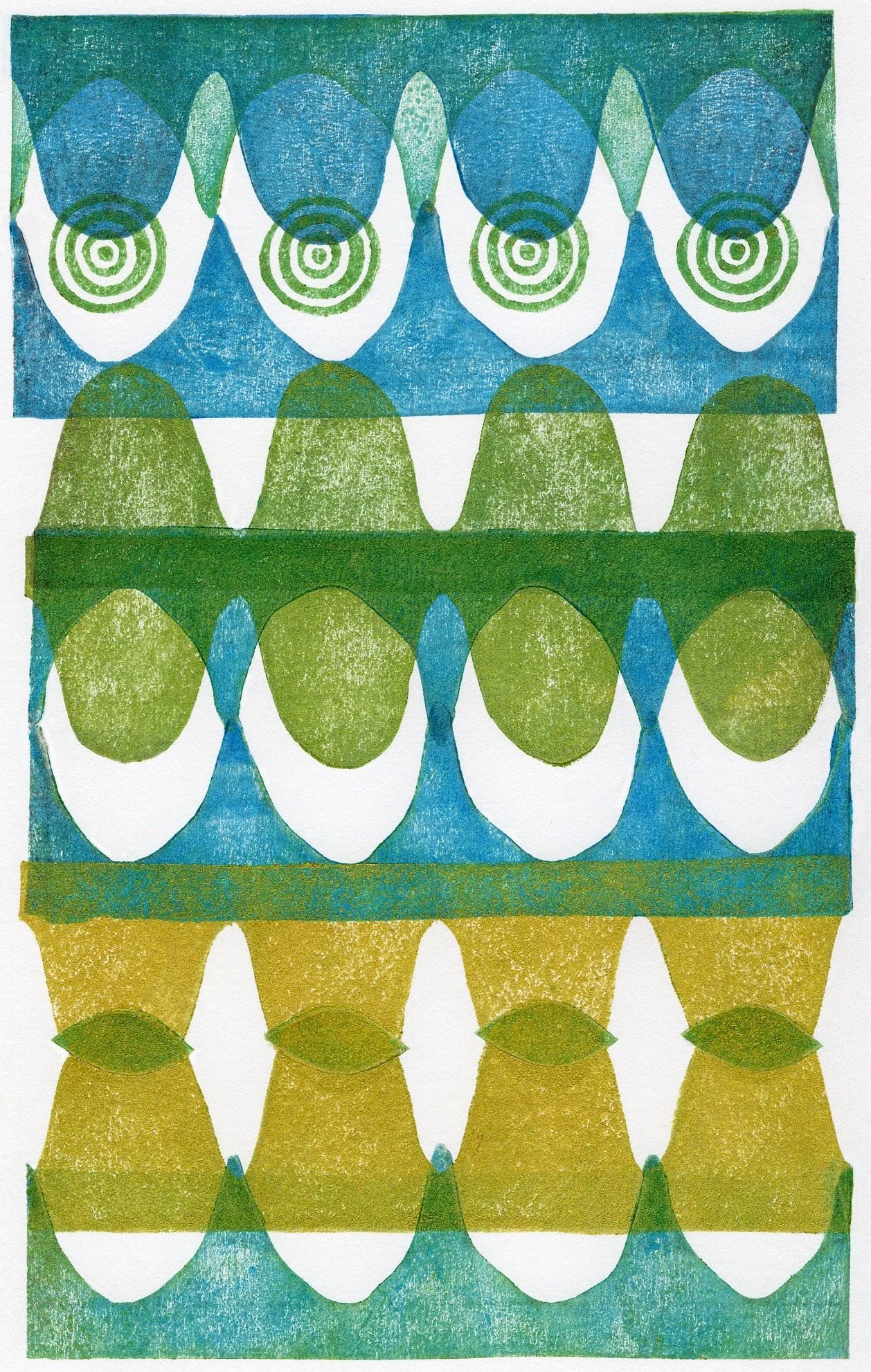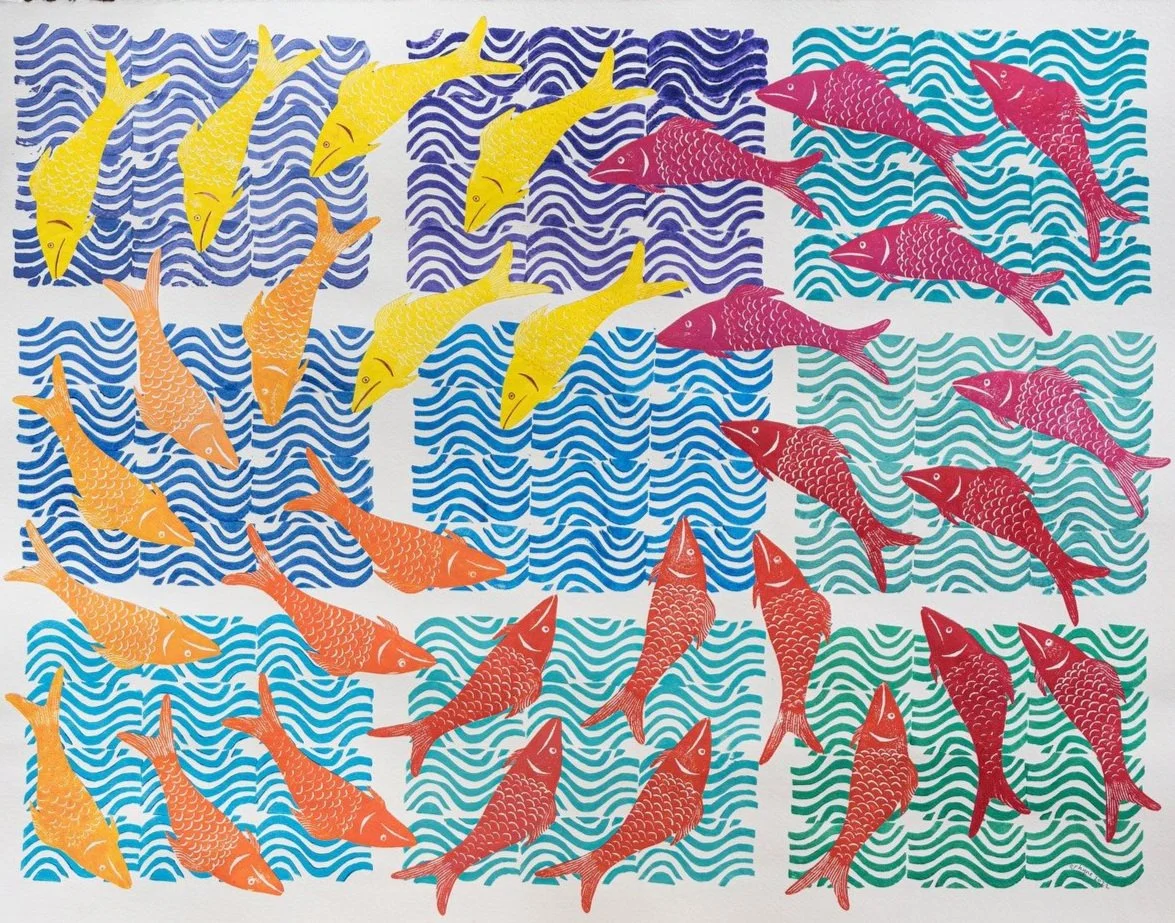 Most artworks are made by relief printing with hand-carved rubber stamps, often augmented by paint or collage.
