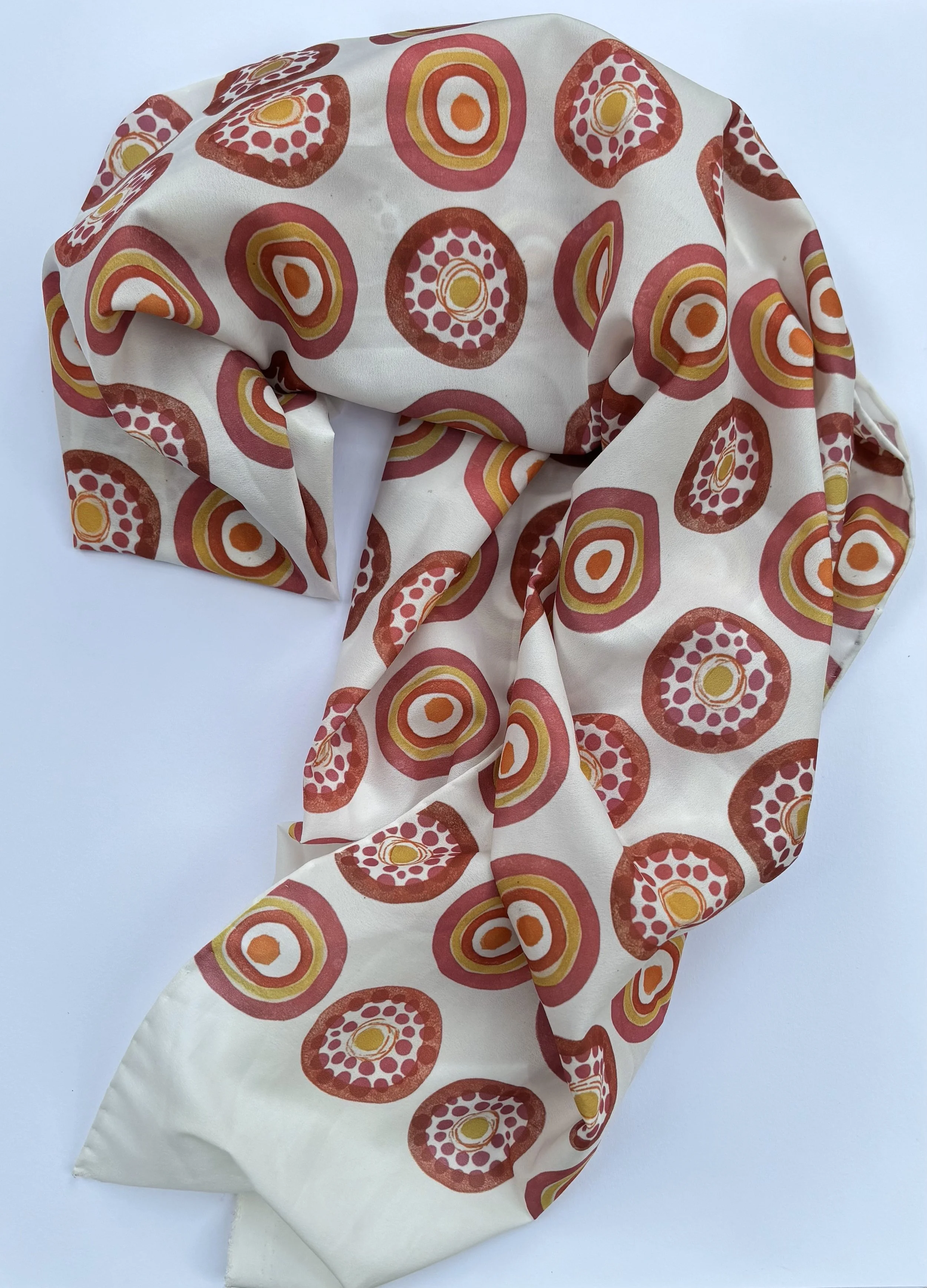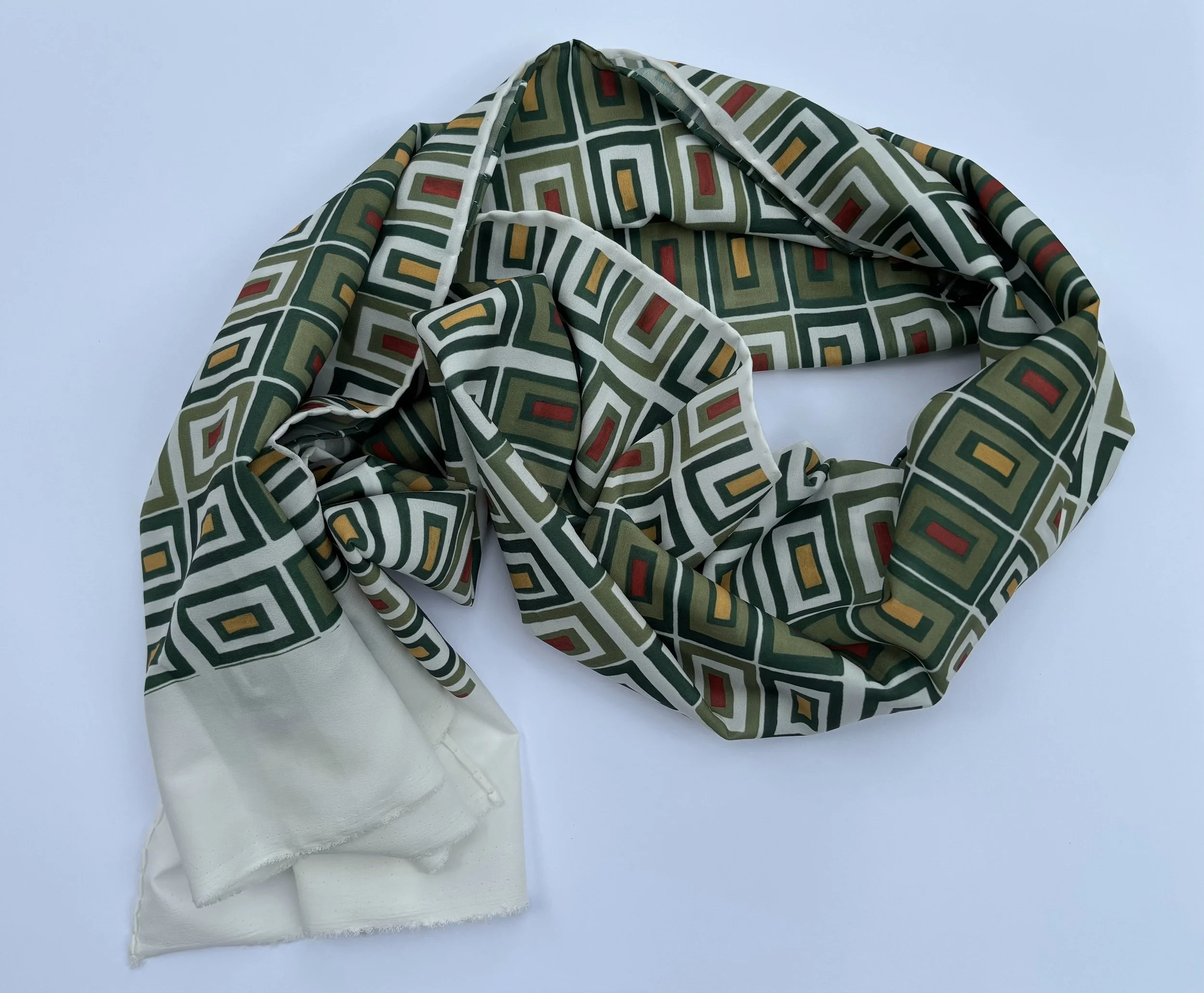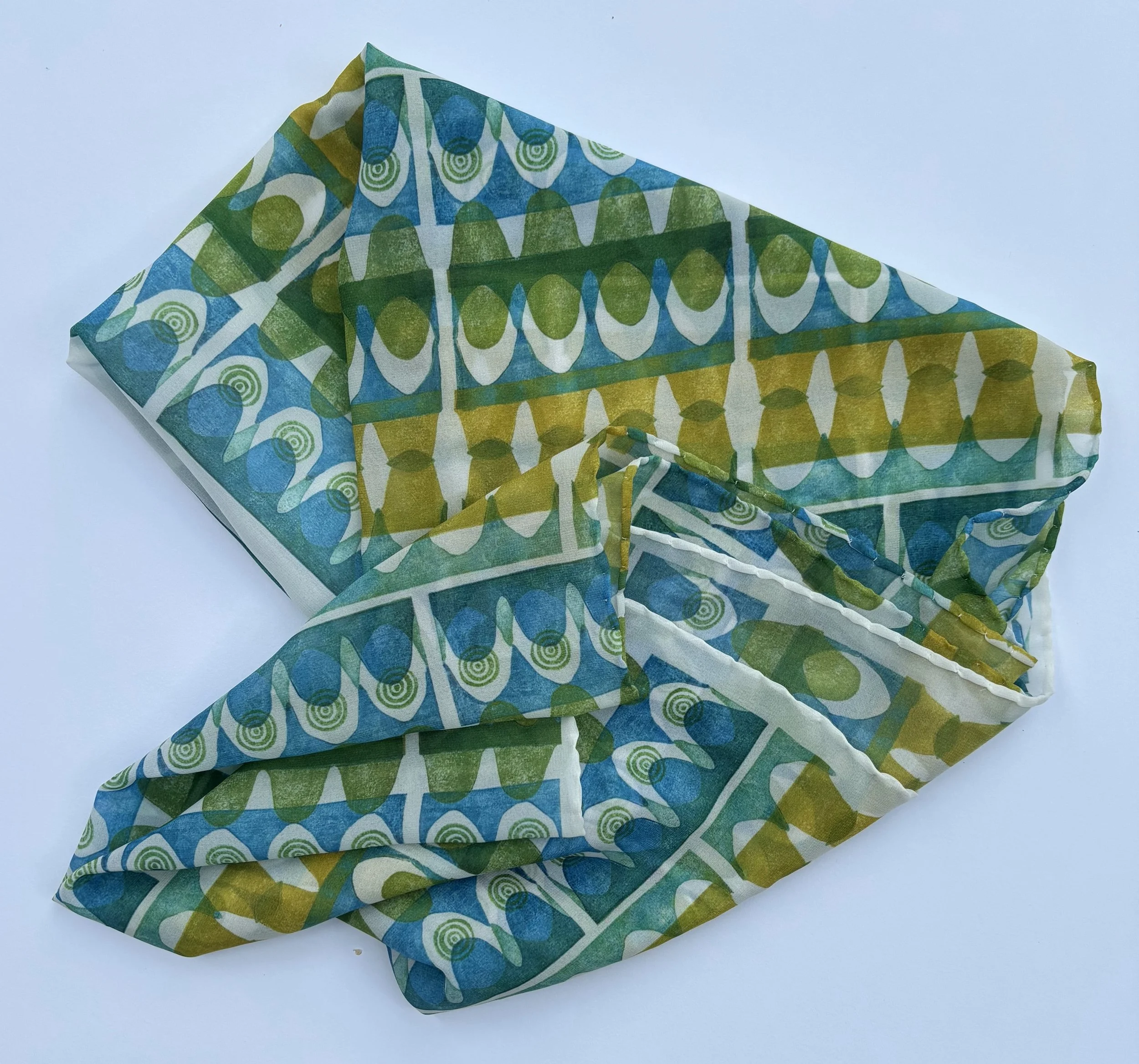 Egg Stack scarf $35.00 Happy Circles scarf $35.00 Green Rectangles scarf $35.00 Fingerprint scarf $35.00 Green Flowers scarf $35.00 Convert long scarf to infinity scarf. $3.00 Athena tote bag $35.00 Teacups tea towel $18.00 Triangles quilt $125.00
